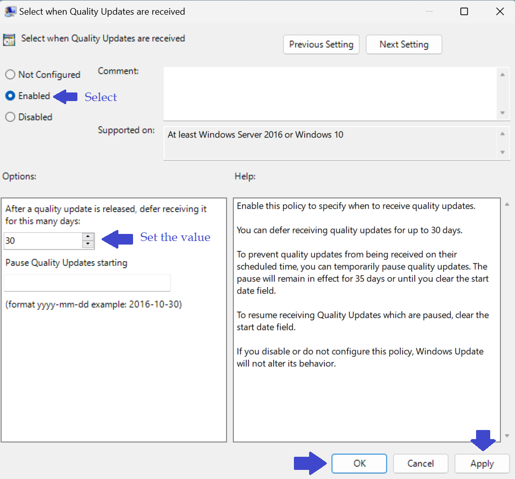 Укажіть кількість днів, на яку затримується оновлення якості після його випуску. Ви можете відкласти його на 30 днів. Ви також можете призупинити оновлення на термін до 35 днів.