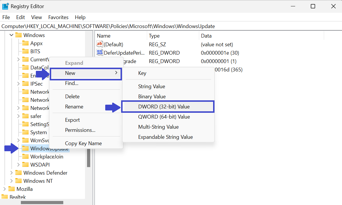 4. Після створення ключа WindowsUpdate створіть нове значення DWORD (32-розрядне) з назвою DeferUpgrade.
