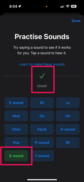 4.після цьогоспробуйте зробити цей звук точно так самобіля мікрофона вашого пристрою. Якщо ви зробите це правильно, ви побачитезвукова плитка стає зеленою, і a“чудово”сповіщувач відображається на анімації сигналу.