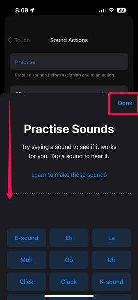 Виконайте наведені нижче дії, щоб дізнатися більше про різні звуки та налаштувати їх для виконання різних дій, таких як відкриття екрана блокування, запуск ярликів Siri, прокручування, повернення на головний екран та інші: