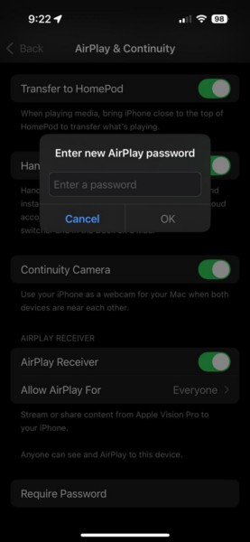 7.Ви також можетеувімкніть опцію «Вимагати пароль».і створіть новий пароль AirPlay, щоб захистити з’єднання.