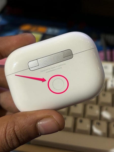 2. Натисніть і утримуйте круглу кнопкуна задній частині футляра для зарядки AirPods.