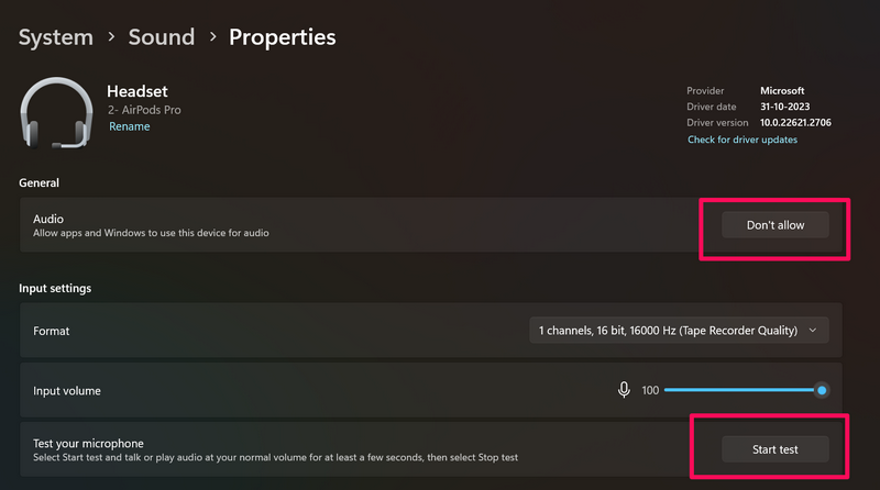 Підключивши навушники, надіньте їх, переконайтеся, що вони вибрані для аудіо та мікрофона на вашому комп’ютері чи ноутбуці з Windows 11, і перевірте, чи вирішено проблему з непрацюючим мікрофоном AirPods на вашому пристрої.