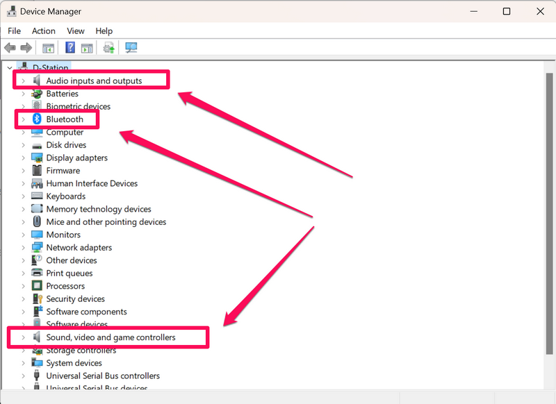 2.Тепер розгорнітьАудіовходи та виходирозділ,Bluetoothрозділ, іКонтролери звуку, відео та ігорза допомогою кнопки зі стрілкою біля кожного з них.