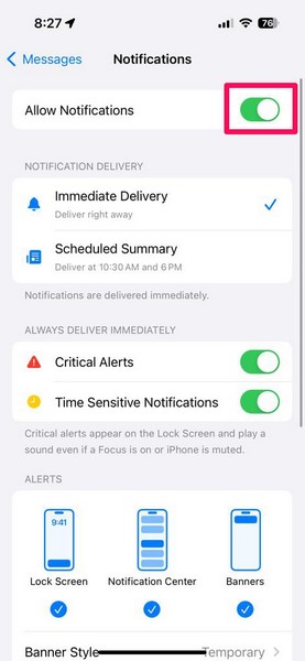4.Тут, перш за все, переконайтеся, що перемикач дляДозволити сповіщенняопція ввімкнена на вашому пристрої.