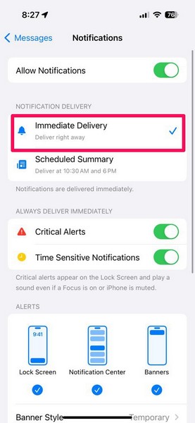 5.Потім переконайтеся, щоНегайна доставкаопція позначена в розділі «Доставка сповіщень».