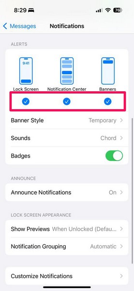 7.Далі переконайтеся, що всі доступні параметри в розділі «Сповіщення» –Екран блокування,Центр сповіщень, ібанериперевіряються. Ви також можете переглянути налаштування стилю банера та звуків, щоб налаштувати їх відповідно до ваших уподобань. Крім того, переконайтеся, що перемикач значків також увімкнено.