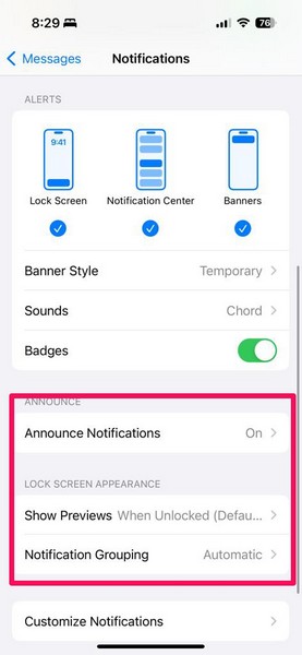 8.Ви також можете поглянути наОголосити сповіщення,Показати попередній перегляд, іГрупування сповіщеньпараметри, щоб налаштувати їх.