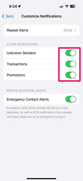 10.На наступній сторінці переконайтеся, що tвін перемикає, щоб увімкнути всі доступні параметрина вашому пристрої. Якщо ви хочете отримувати повторні сповіщення для сповіщень iMessage, ви можете торкнутисяПовторні сповіщенняі налаштуйте його відповідно до ваших уподобань.