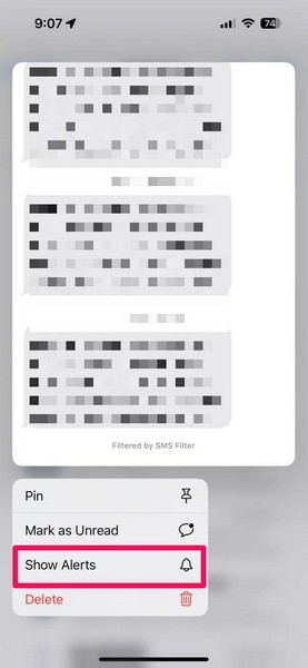 5.Крім того, ви можетеутримуйте приглушену розмовуі виберітьПоказати сповіщенняу контекстному меню. Ви можете зробити те саме для інших вимкнених розмов iMessage на своєму пристрої.