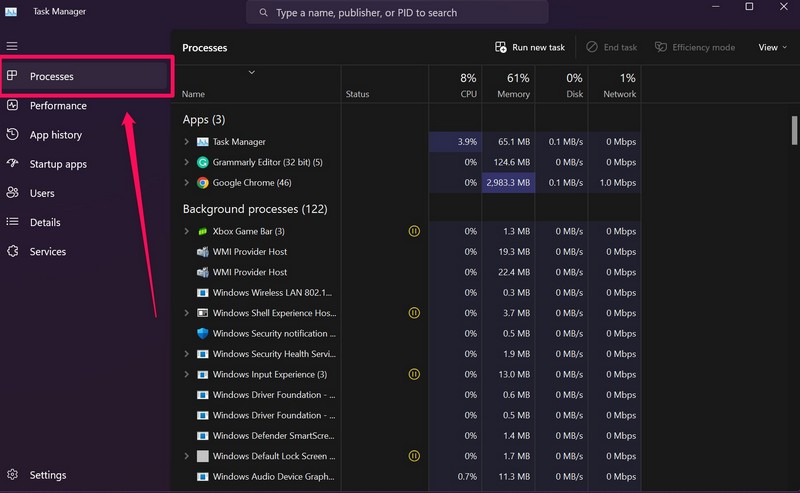 2.Використовуйте кнопку Tab, щоб перейти доВкладка «Процеси».на лівій навігаційній панелі, якщо вона ще не відкрита, і натисніть пробіл, щоб відкрити її.