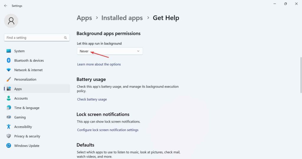 Крок 6:Тепер знайдітьДозвіл фонових програмрозділ і виберітьНіколизі спадного меню.