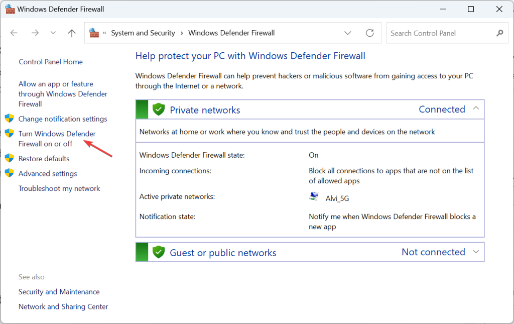 крок 3:Тепер виберітьУвімкніть брандмауер Windows Defender увімкнути або вимкнутина лівій панелі.