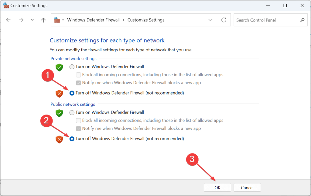 крок 4:Тепер натисніть наВимкніть брандмауер Windows DefenderпідПриватна мережаі подНалаштування публічної мережі.