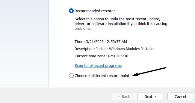 3.ВиберітьВиберіть іншу точку відновленняу наступному запиті, а потім натисніть наДалікнопку.