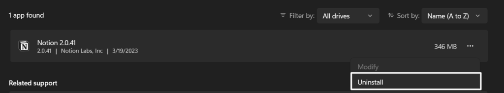 Одним із найпоширеніших способів вирішення проблем, пов’язаних із програмою, є перевстановлення програми; тому ми пропонуємо вам зробити те саме з Notion. Це призведе до видалення всіх даних програми з вашого ПК з Windows 11 і може вирішити проблеми з нею. Отже, спробуйтеперевстановлення програми Notionу вашій системі, дотримуючись наведених нижче інструкцій, і перевірте, чи це вирішує проблему: