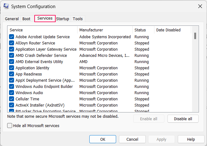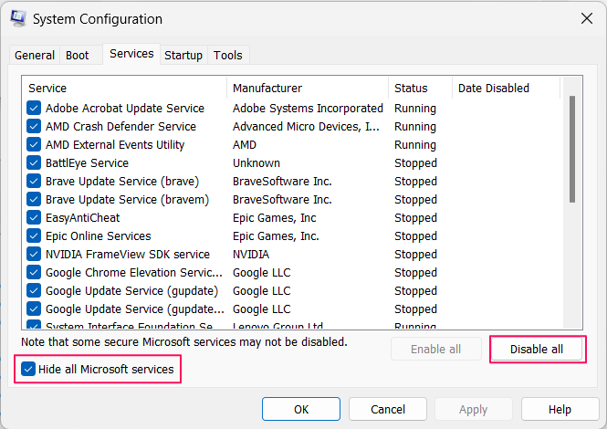 Крок 3.Натисніть наПриховати всі служби Microsoftпараметр, а потім натиснітьВимкнути всі.
