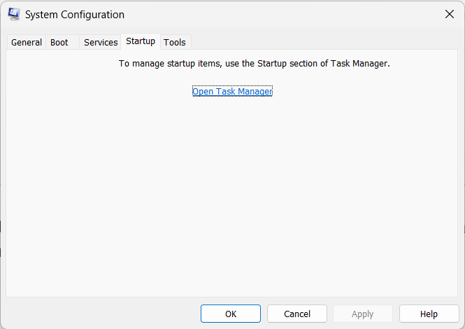 Крок 4.Прямуйте доЗапусквкладку та натиснітьВідкрийте диспетчер завдань.