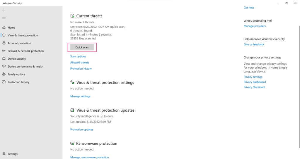 Щоб отримати доступ до цієї функції, перейдіть у налаштування «Захист від вірусів і загроз» і натисніть кнопку «Швидке сканування». Сканування займе кілька хвилин. Припустимо, він знаходить деякі помилки; ви побачите їх у розділі «Налаштування захисту від вірусів і загроз».