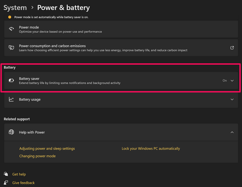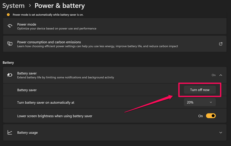 Ще одна поширена причина, чому ефект прозорості в Windows 11 може не працювати, — це режим енергозбереження. Режим енергозбереження в Windows 11 — це системна функція, яка може бути дуже корисною для користувачів ноутбуків у певних ситуаціях. Однак для економії енергії вашого пристрою режим економії заряду акумулятора фактично вимикає всі ефекти та дизайнерські матеріали в Windows, які можуть споживати додатковий заряд акумулятора.