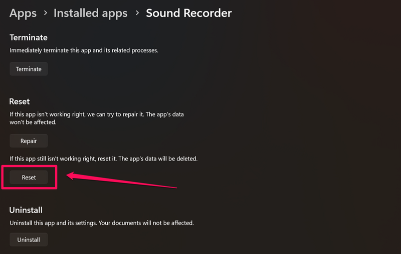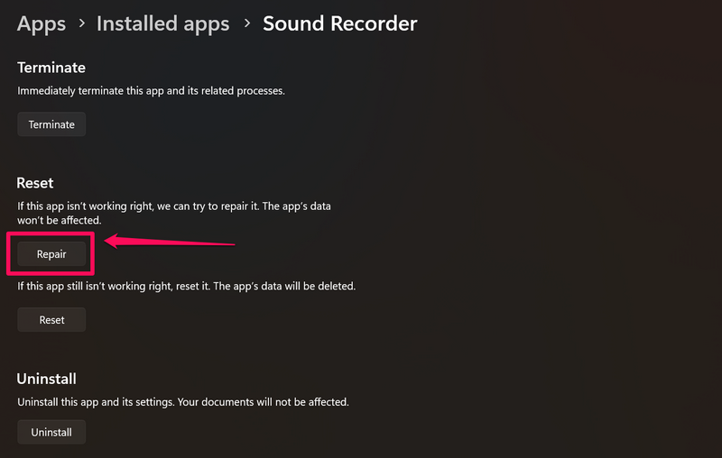 Тепер, якщо ви використовуєте вбудовану програму Windows Sound Recorder для запису свого голосу та стикаєтеся з проблемою, що диктофон не працює в Windows 11, ви можете спробувати відновити або скинути програму на своєму пристрої.