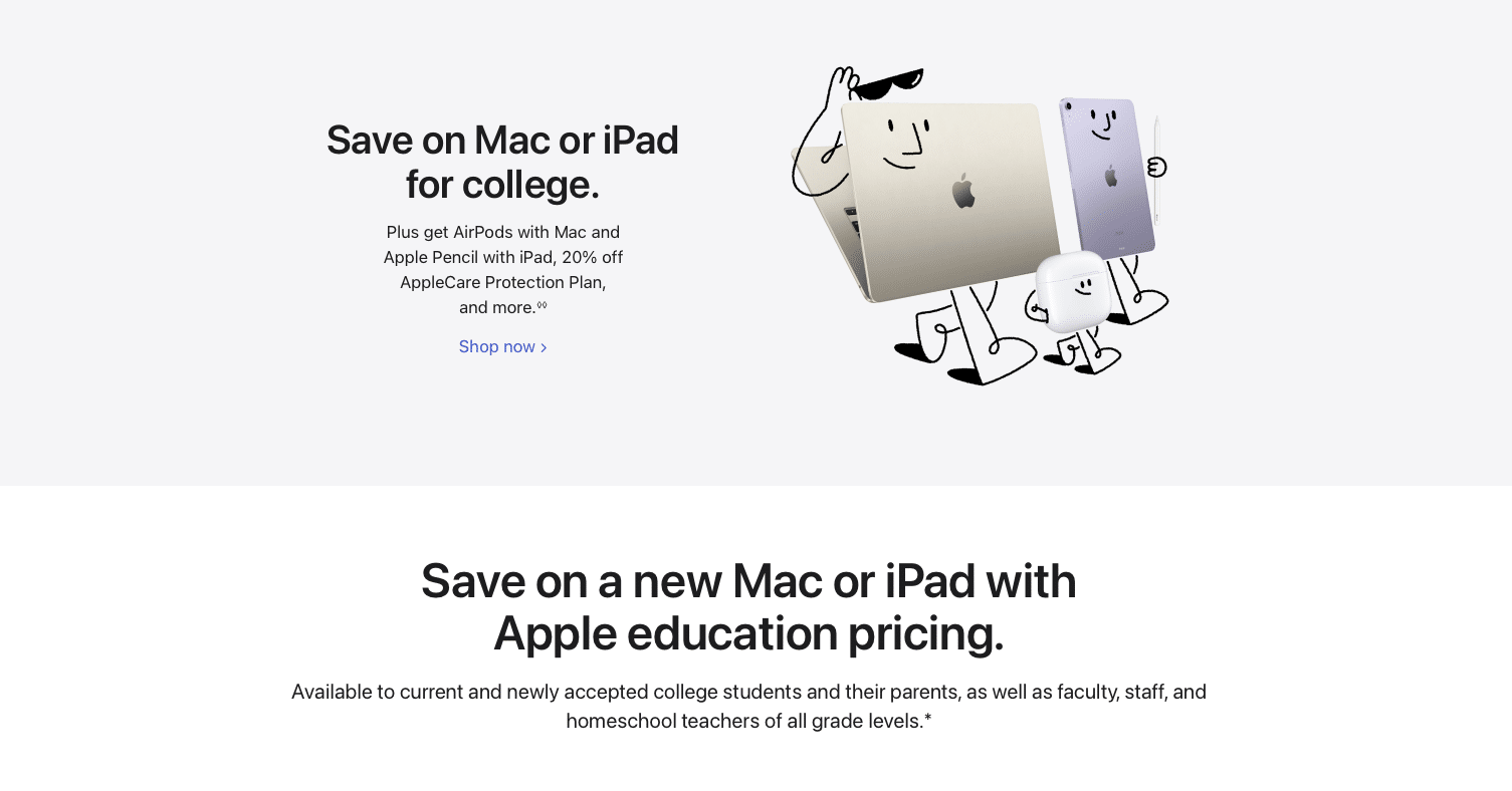 Щороку Apple також пропонує промо-акцію «Повернення до школи». У рамках пропозиції щодо вищої освіти на 2023 рік кваліфіковані покупці, які купують відповідний продукт, отримують подарункову картку Apple на додаток до ціни зі знижкою. Нижче наведено відповідні продукти та відповідні подарункові картки: