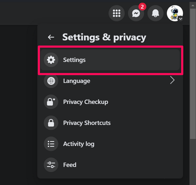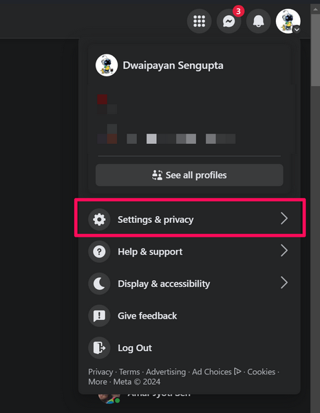 3. Клацніть значок свого профілю Facebookу верхньому лівому куті та виберітьНалаштування та конфіденційністьваріант.