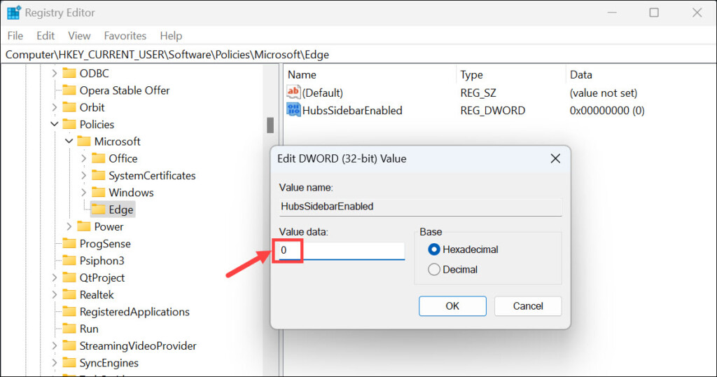 6.Двічі клацніть HubsSidebarEnabled і встановіть йогоЗначення даних до 0якщо це ще не так.