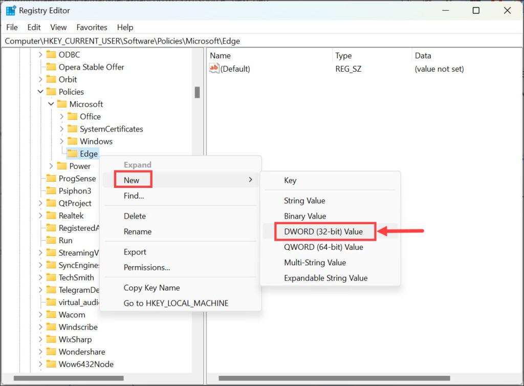 5.Тепер клацніть правою кнопкою миші щойно створений ключ Edge і виберітьНове->DWORD (32-розрядне) значення.Назвіть цеHubsSidebarEnabled.