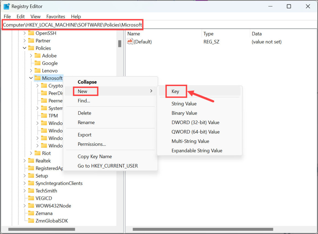 HKEY_LOCAL_MACHINESOFTWAREPoliciesMicrosoft4.На лівій панелі клацніть правою кнопкою миші папку Microsoft і виберітьНовий->Ключ.Назвіть цей ключКрай.