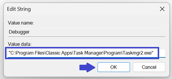 Щоб створити його, клацніть правою кнопкою миші taskmgr.exe => New => String value. Введіть «Debugger» і натисніть OK.