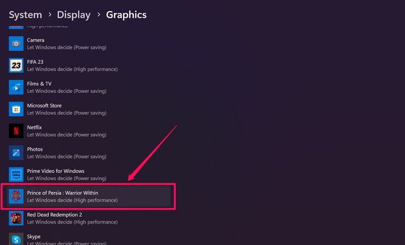 5. Знайдіть додаток або програмудля якої ви хочете встановити графічну карту за замовчуванням у списку програм, інатисніть на нього. Для цієї демонстрації ми вибрали гру Prince of Persia: Warrior Within (скріншот нижче).