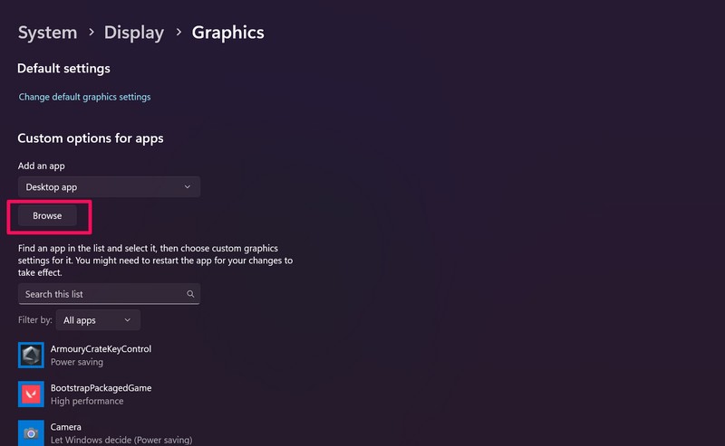 10.Для цього спочатку клацніть поле підДодайте програмуна сторінці «Графіка» програми «Параметри» на пристрої з Windows 11.