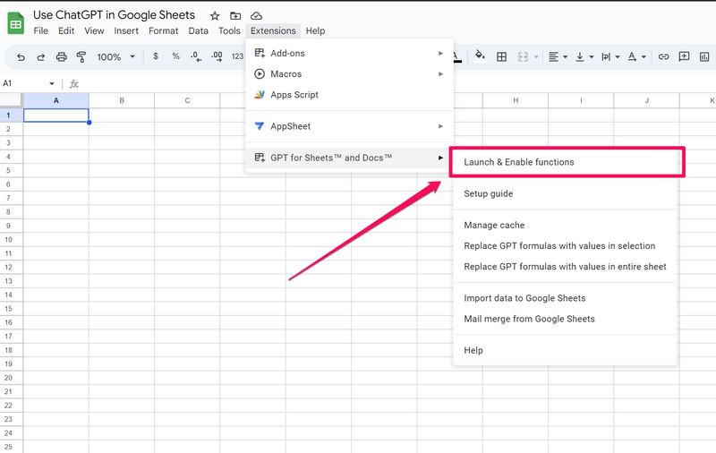 Тепер, коли ви успішно встановили та налаштували GPT для Таблиць і Документів у Google Таблицях, настав час дізнатися, як можнамати доступ до нього під час роботи в Таблицях.