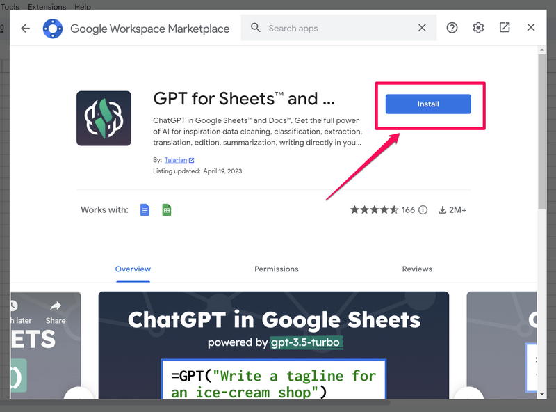 Хоча в наступному розділі ми обговоримо переваги використання GPT для Таблиць і Документів у Google Таблицях із прикладами, спершу розглянемо, як можна інсталювати розширення.