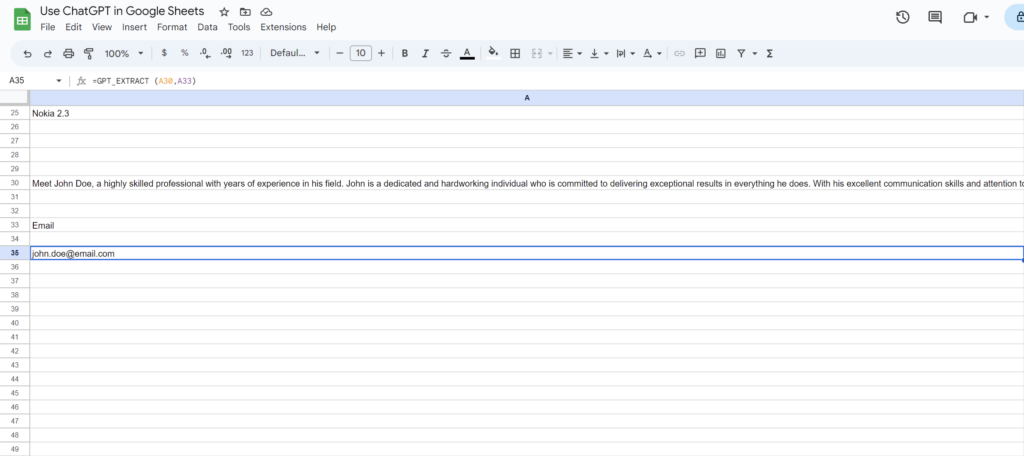 Як приклад, ми створили випадковий вступ для Джона Доу з адресою електронної пошти в клітинці A30, вказали тип даних (у цьому випадку, електронну пошту), які ми хочемо витягти в клітинці A33, і використали функцію=GPT_EXTRACT (A30,A33)щоб отримати адресу електронної пошти з фрагмента тексту в A30. Це спрацювало як шарм!
