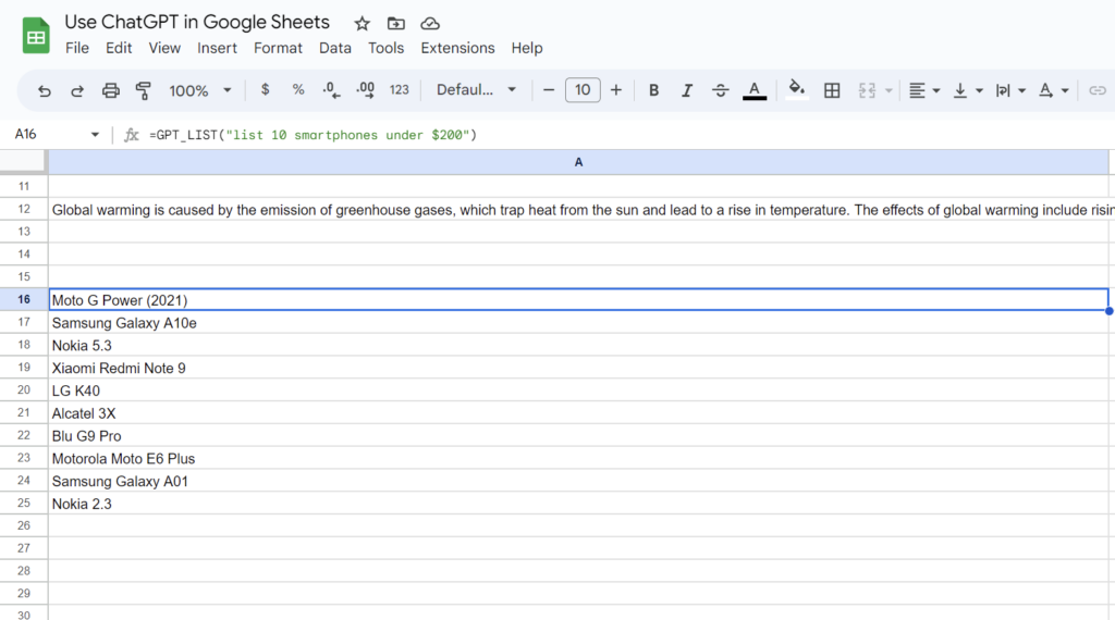 Отже, якщо ми хочемо додати список смартфонів, які можна купити до 200 доларів, у нашу електронну таблицю Google Sheet, нам просто потрібно викликати функцію списку та вказати деталі. У цьому випадку запит буде таким:=GPT_LIST («список 10 смартфонів до 200 доларів США»).
