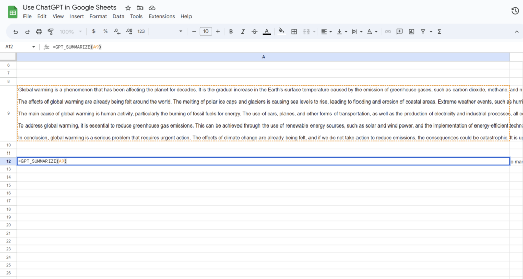 Як приклад, ми змусили GPT для Таблиць і Документів створити статтю з 200 слів про глобальне потепління в клітинці A9 та узагальнили вміст у клітинці A12. Ви можете перевірити результат на наступному знімку екрана.