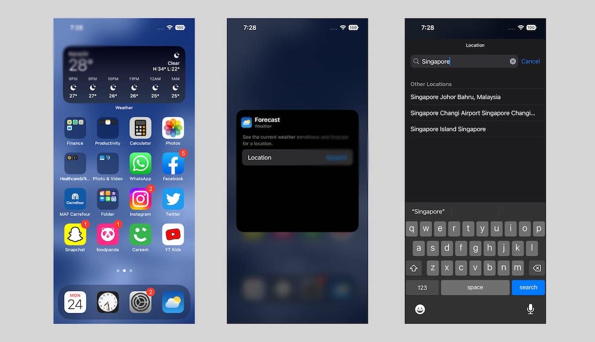 - Проведіть пальцем ліворуч або праворуч, щоб переглянути всі поточні погодні умови та віджети прогнозу, і натисніть «Додати віджет» для бажаного віджета погоди.