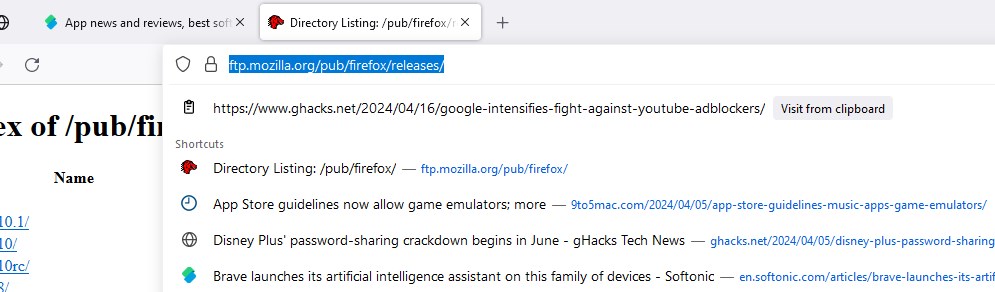 У Firefox є нова функція під назвою «Пропозиція вставлення URL-адреси». Коли ви фокусуєтеся на адресному рядку, а буфер обміну містить URL-адресу, браузер автоматично виявляє її та автоматично відображає результат автозаповнення. Ви можете натиснути на пропозицію з позначкою «Відвідати з буфера обміну», щоб перейти до URL-адреси одним клацанням. Це альтернативна версія функції «Вставити та перейти», за винятком того, що вам не потрібно клацати правою кнопкою миші та вибирати опцію в меню.