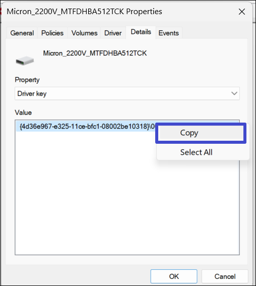 3. У вікні властивостей перейдіть доПодробиці" та виберіть "Ключ водія" з "Власність” спадного списку.