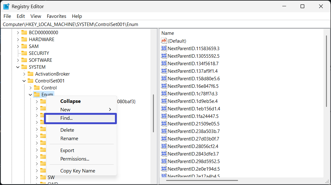 3. Тепер клацніть правою кнопкою миші «Enum” клавішу/папку та виберіть „знайти“.