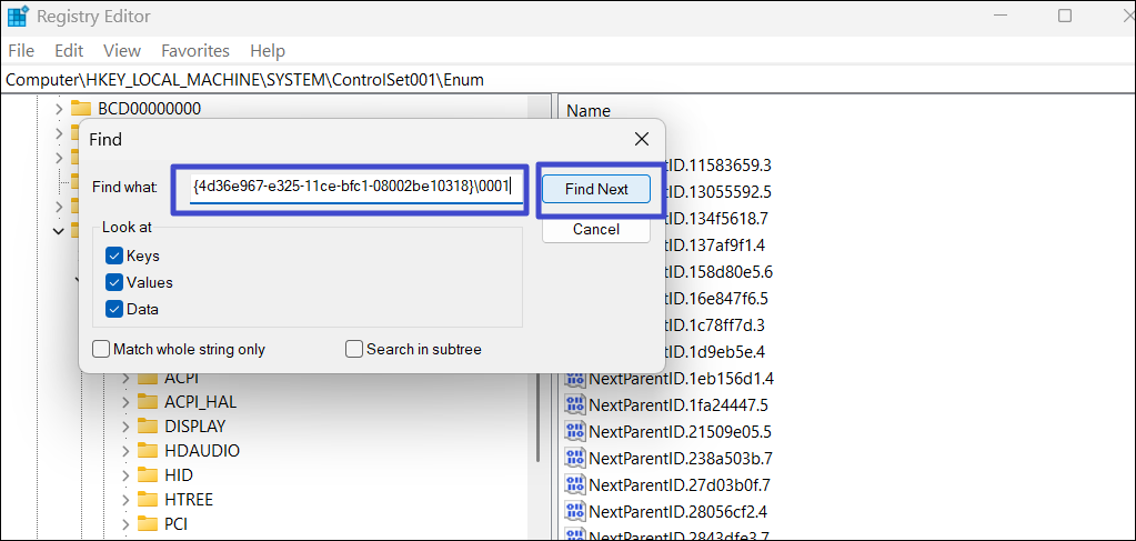 4. У розділі «Знайти що", вставте ключ драйвера, який ви скопіювали раніше з диспетчера пристроїв, і натисніть "Знайти далі“.
