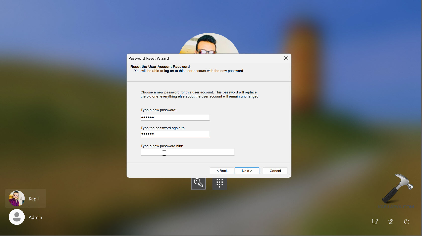 6. Якщо диск для скидання пароля було розпізнано, вам буде запропоновано створити новий пароль. Ви можете ввести новий пароль, підтвердити його, а потім встановити за допомогою підказки до пароля.