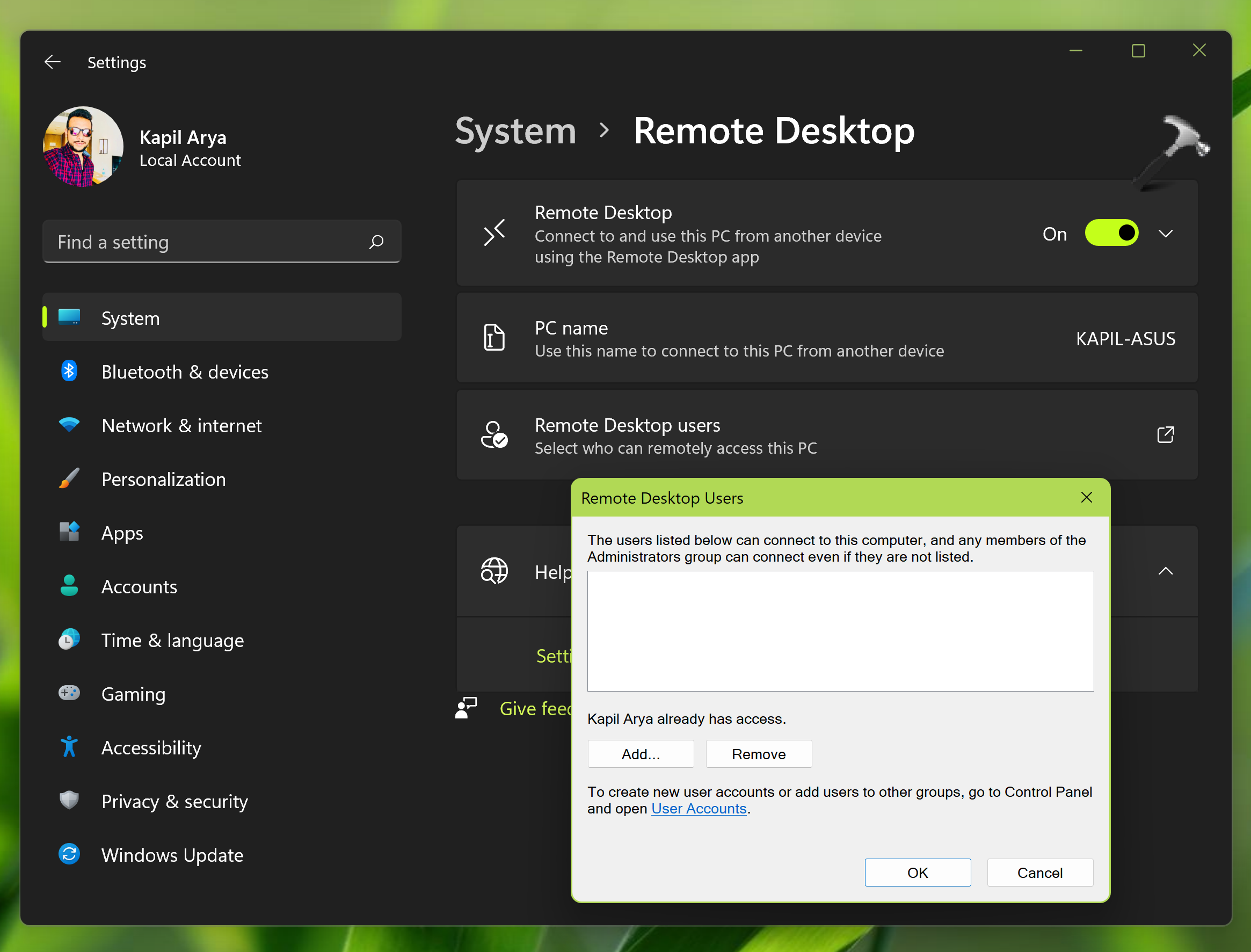 Коли віддалений робочий стіл увімкнено, важливо, щоб клієнти, яким ви хочете дозволити підключення, мали доступ. Ви можете перейти в додаток Налаштування > Система > Віддалений робочий стіл і натиснути Користувачі віддаленого робочого стола. У спливаючому вікні натисніть кнопку «Додати», а потім дотримуйтесь інструкцій на екрані, щоб додати користувачів або клієнтів для віддаленого робочого столу.