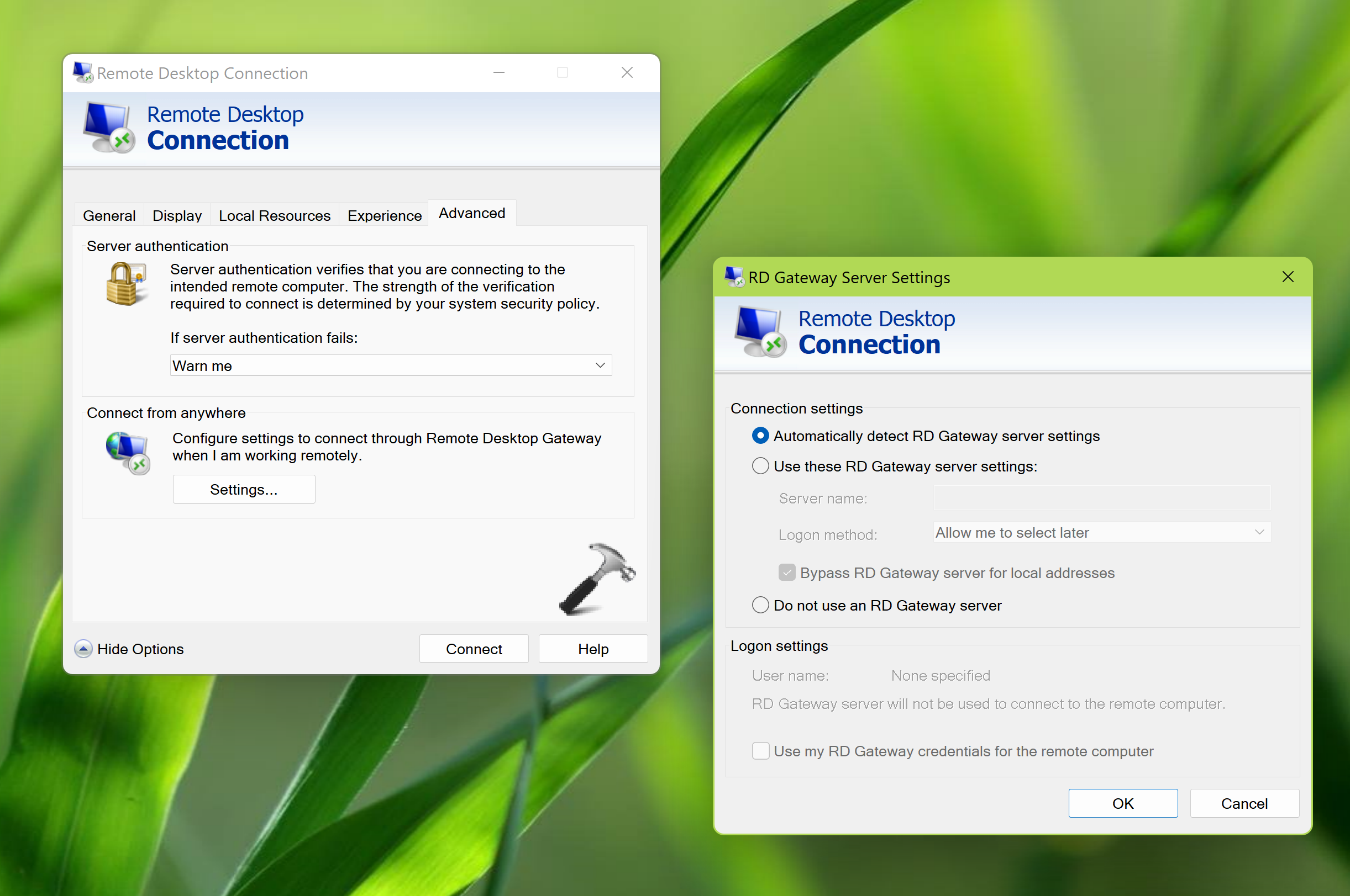 Для цього вам потрібно відкрити програму Remote Desktop Connection за допомогою Windows Search або Cortana. Коли ця програма відкриється, перейдіть на вкладку «Додатково» та в розділі «Підключитися з будь-якого місця» натисніть наНалаштуваннякнопку там. Далі в налаштуваннях сервера RD Gateway виберітьАвтоматичне визначення параметрів сервера RD Gatewayваріант. Натисніть OK.