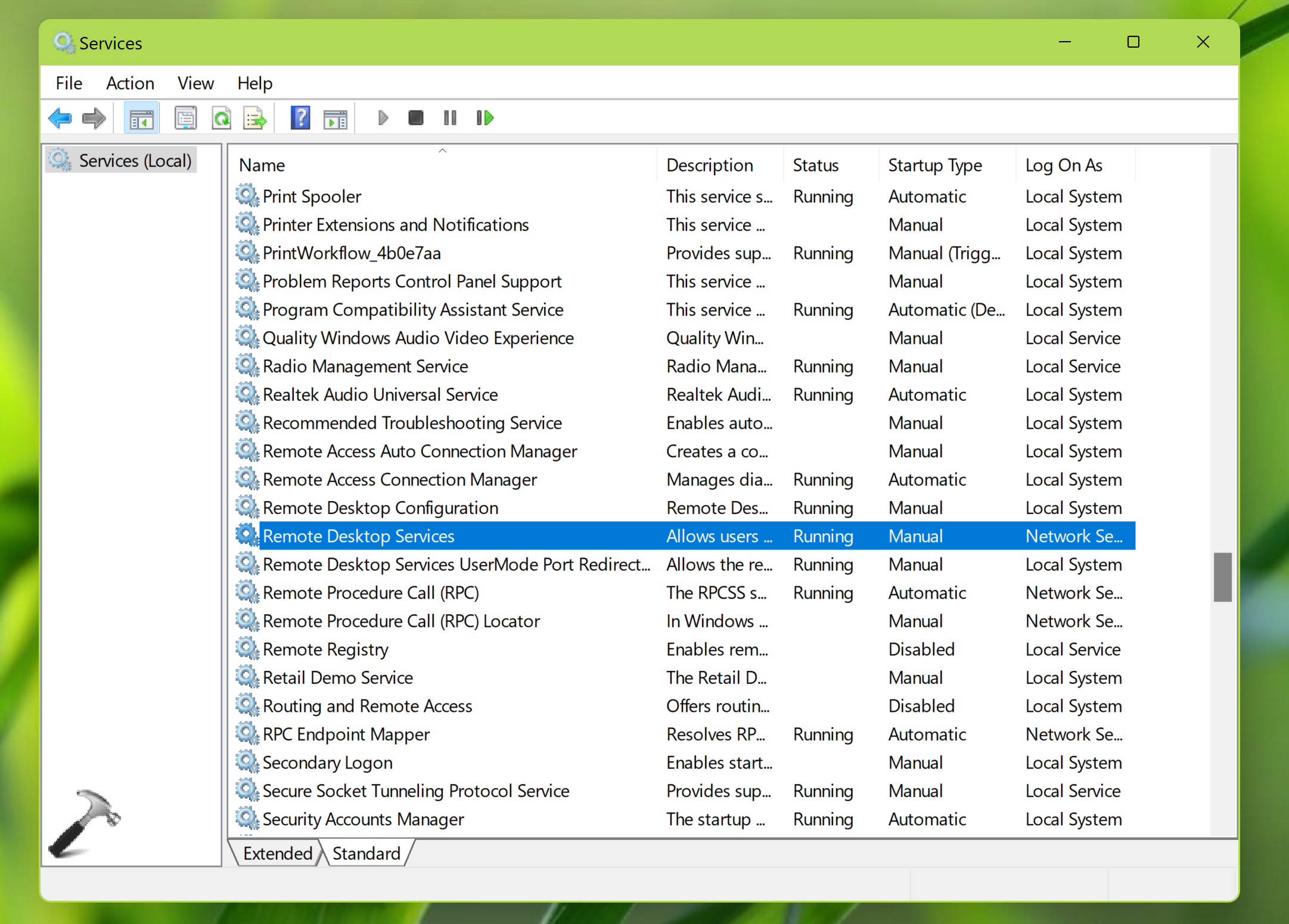 Відкрийте оснастку «Служби», запустившиservices.mscкоманда. У вікні служб прокрутіть вниз і знайдіть служби з іменем Remote Desktop і переконайтеся, що ці служби запущені. Переконайтеся, що жодна з цих служб не вимкнула тип запуску.