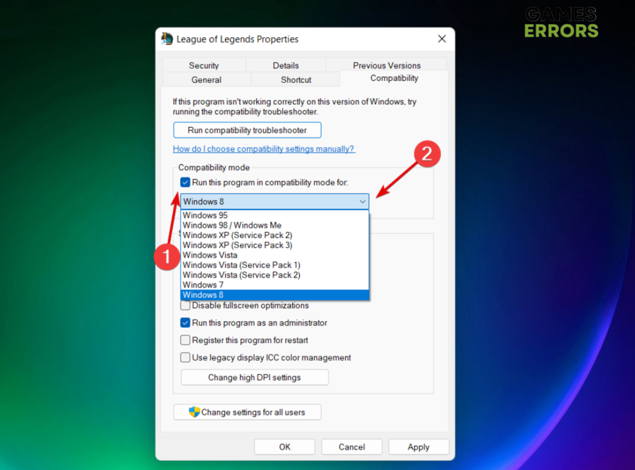 4. Тепер поставте галочкуЗапустіть цю програму в режимі сумісності дляпотім виберіть опцію зі спадного меню (як показано на малюнку нижче).