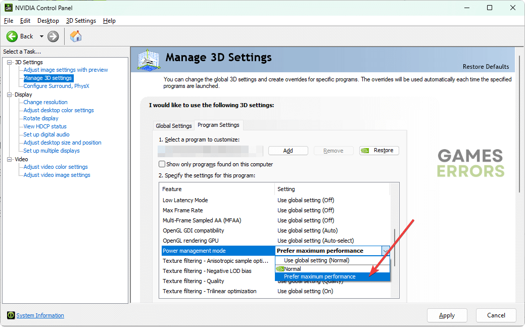 - встановитиРежим керування живленнямВіддати перевагу максимальній продуктивності.